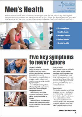Click the image to read or download our Men’s Health Guide. Articles on many of the main health issues affecting men, including: